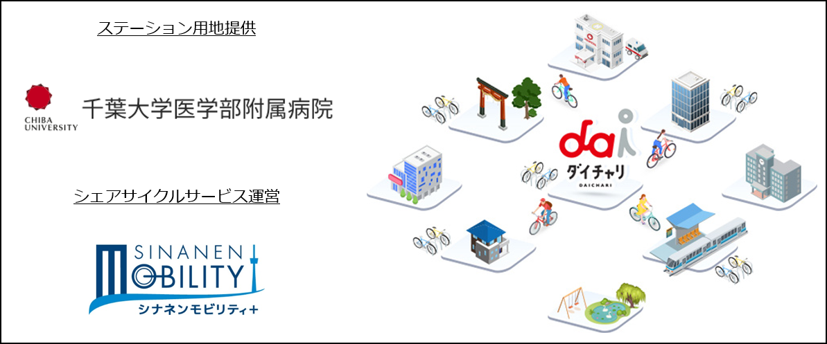 エネルギー・住まい・暮らしの総合サービス事業を展開するシナネンホールディングス株式会社(本社:東京都港区、代表取締役社長:山﨑 正毅)の子会社で、移動を楽しく、快適にするシェアサイクル「ダイチャリ」を運営するシナネンモビリティPLUS株式会社(本社:東京都港区、代表取締役社長:菅原 健)は、4月1日(月)より、「千葉大学医学部附属病院」に、シェアサイクル「ダイチャリ」のステーションを設置し、運営を開始したことをお知らせいたします。
