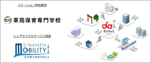 エネルギー・住まい・暮らしの総合サービス事業を展開するシナネンホールディングス株式会社(本社:東京都品川区、代表取締役社長:中込 太郎)の子会社で、移動を楽しく、快適にするシェアサイクル「ダイチャリ」を運営するシナネンモビリティPLUS株式会社(本社:東京都品川区、代表取締役社長:菅原 健)は、「実力ある保育者を育てる草苑」として幅広く特色あるカリキュラムを受講することができる、草苑保育専門学校(本所:東京都豊島区、理事長:柳内 光子) の敷地内に、シェアサイクル「ダイチャリ」を設置し、2月9日(月)より運営を開始したことをお知らせいたします。