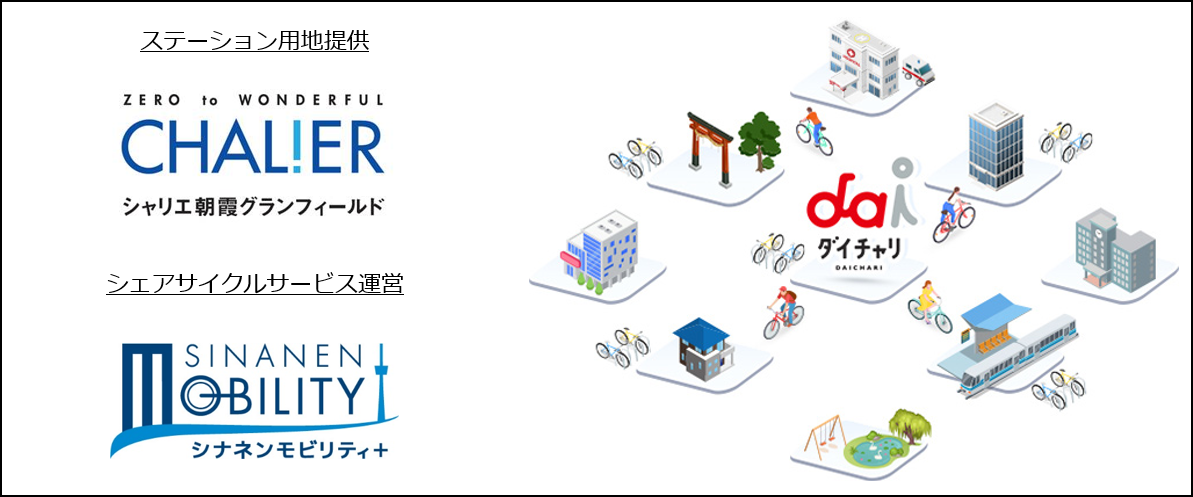エネルギー・住まい・暮らしの総合サービス事業を展開するシナネンホールディングス株式会社(本社:東京都港区、代表取締役社長:山﨑 正毅)の子会社で、移動を楽しく、快適にするシェアサイクル「ダイチャリ」を運営するシナネンモビリティPLUS株式会社(本社:東京都港区、代表取締役社長:菅原 健)は、2月22日(木)より、新築分譲マンション「シャリエ朝霞グランフィールド」に、シェアサイクル「ダイチャリ」のステーションを設置し、運営を開始したことをお知らせいたします。なお、関東の分譲マンション「シャリエ」シリーズでは初めてのシェアサイクルサービスの導入となります。