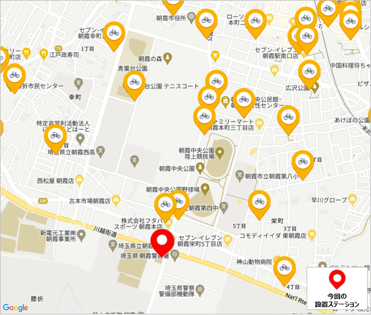 「シャリエ朝霞グランフィールド」の最寄り駅である東武東上線朝霞駅周辺(駅から300m圏内)には、既に「HELLO CYCLING」のステーションが9ヶ所、124ラック設置されており、マンションと駅周辺の往来にもシェアサイクルを活用しやすい環境です。